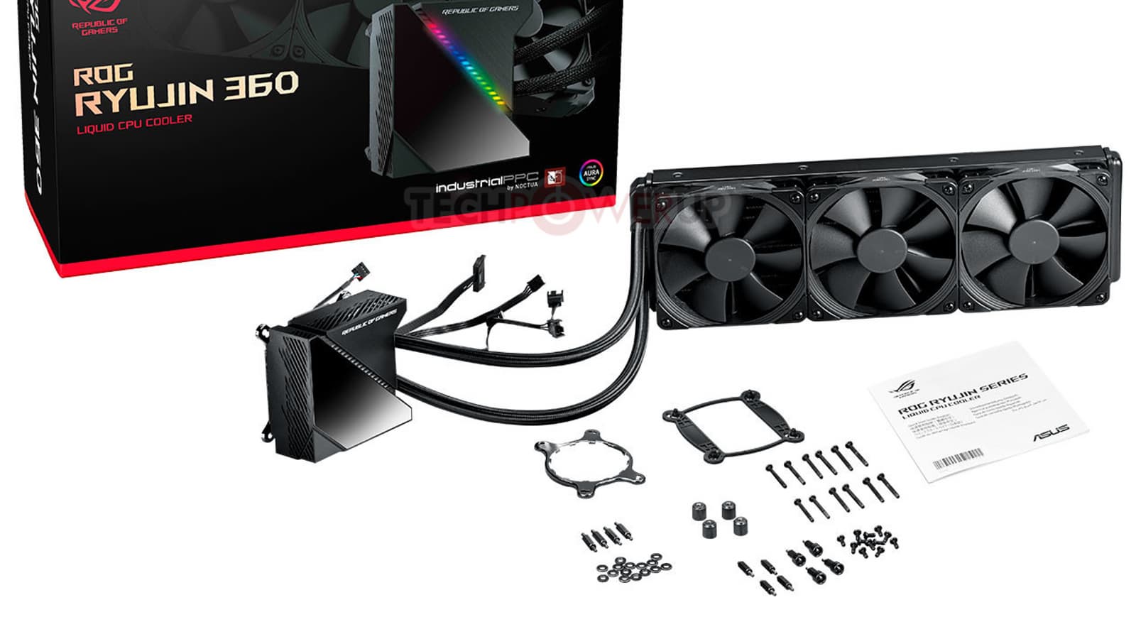Радиатор связан с водоблоком, совмещенным с помпой. Помпа оснащена экраном OLED размером 1,77 дюйма. По умолчанию на экране отображается анимированный логотип ROG, но его можно перепрограммировать на вывод других изображений и показаний, характеризующих работу системы охлаждения. Интересной особенностью является наличие небольшого вентилятора, обдувающего непосредственно водоблок.