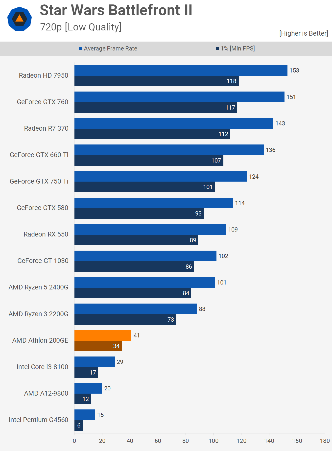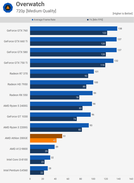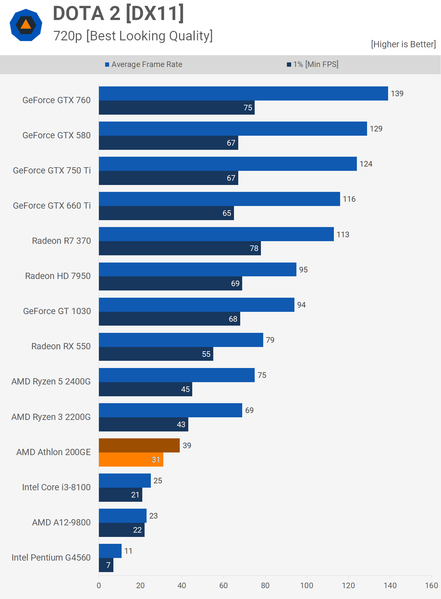 Как видим, ситуация неоднозначна. Где-то новинка существенно быстрее A12-9800, а где-то отстаёт. При этом Athlon 200GE уверенно обходит даже Core i3-8100, который дороже более чем вдвое. Впрочем, говорить об использовании новинки AMD в играх без дискретной видеокарты можно лишь в разрезе старых игр, в некоторых современных при низком разрешении или же в таких проектах, как Dota 2.