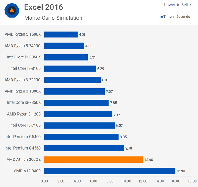 Вчера процессор AMD Athlon 200GE поступил в продажу. И в Сети уже можно найти его первые тесты. Для начала напомним, что сама AMD сравнивала свой новый APU с Pentium G4560, который оценивается в 64 доллара против 55 долларов, которые просят за Athlon 200GE. AMD указывала на примерно равную производительность CPU и намного большую производительность интегрированного GPU.