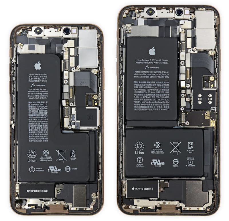 Старшая модель, iPhone XS Max, унаследовала двойной аккумулятор, как у iPhone X. Он сходной формы с батареей в iPhone XS, но состоит из двух элементов. Подобное решение использовалось, чтобы справиться с термическим расширением. Ёмкость батарей iPhone XS и XS Max составляет 2659 и 3179 мА·ч, соответственно.