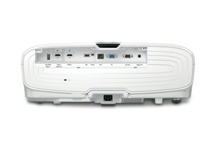 Список портов включает HDMI (с поддержкой HDCP 2.2), HDMI (с поддержкой HDCP 1.4), USB Type A (только для питания оптического кабеля HDMI, нагрузочная способность 300 мА), USB (для беспроводного адаптера и обновления прошивки), mini-USB (сервисный), LAN (RJ-45), VGA (D-Sub 15 контактов), RS-232c (D-Sub 9 контактов).
