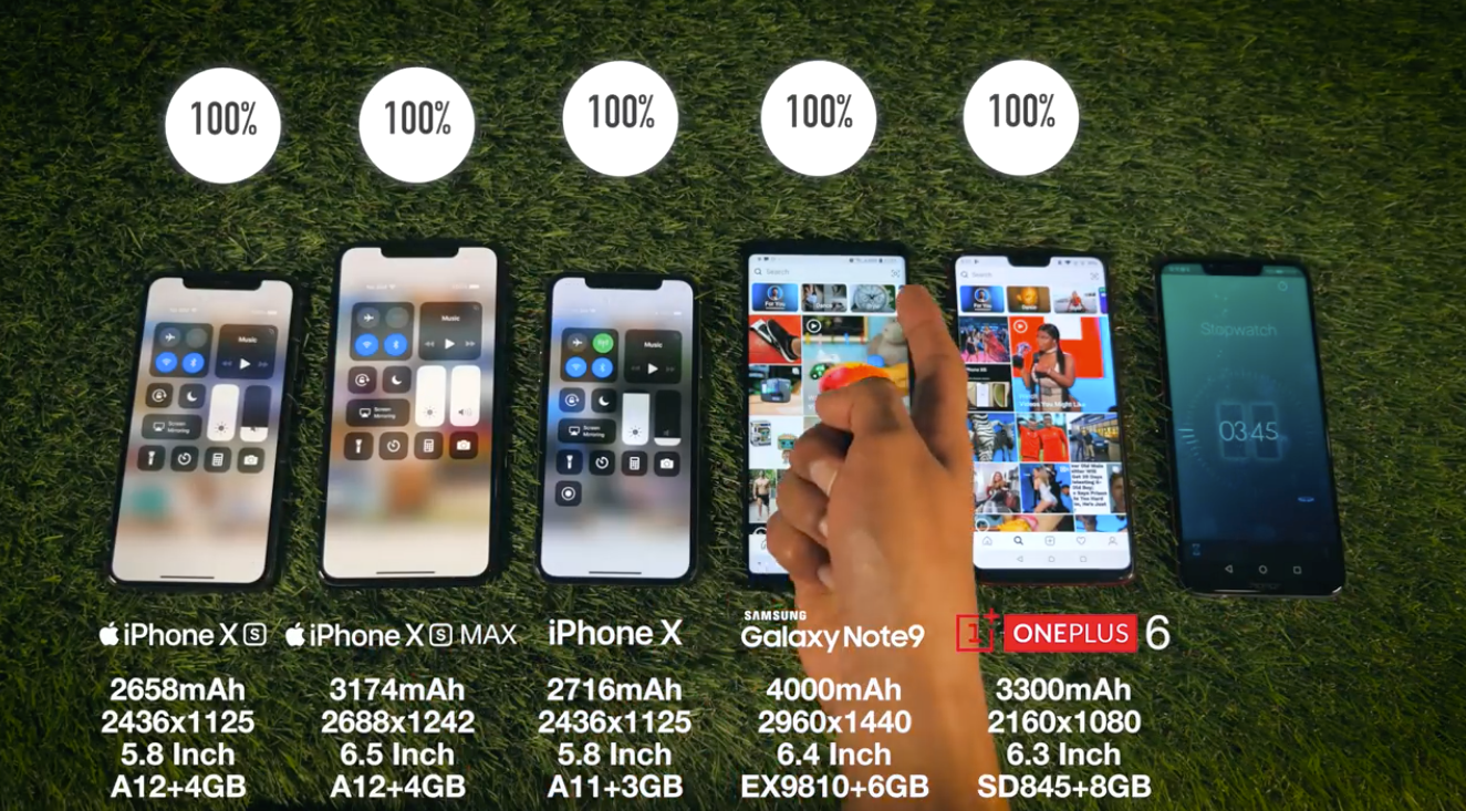 Испытанию подверглись новейшие iPhone XS и iPhone XS Max, вышедший немного раньше Samsung Galaxy Note9, прошлогодний iPhone X и OnePlus 6, выпущенный в мае.
