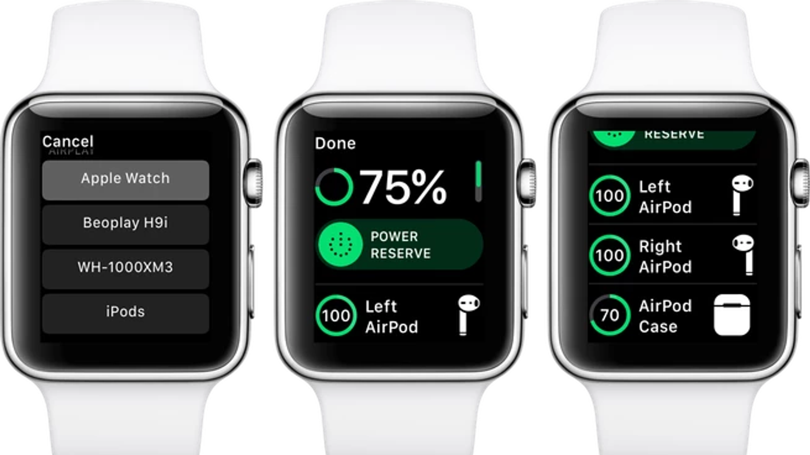 Чтобы посмотреть уровень заряда Apple Watch, надо убедиться, что гарнитура подключена к часам. Иконка AirPlay в Control Center должна быть синей, нужно нажать на нее, найти иконку с процентом заряда, после чего вы увидите уровень заряда левого и правого наушников. Если они находятся в футляре, то достаточно открыть его крышку, чтобы узнать уровень заряда футляра.