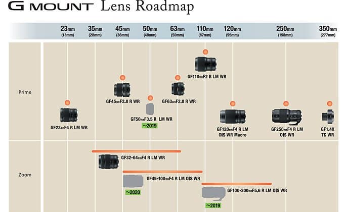 Сроком выпуска GF50mmF3.5 R LM WR и GF100-200mmF5.6 R LM OIS WR назван 2019 год. Выпуск GF45-100mmF4 R LM OIS WR намечен на 2020 год.