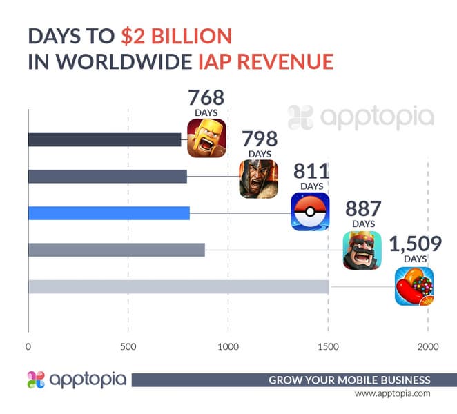 Для достижения этой отметки Pokemon GO понадобилось 811 дней, что, к примеру, быстрее, чем в случае Clash Royale, которой понадобилось 887 дней. Результат выводит Pokemon GO на третье место.