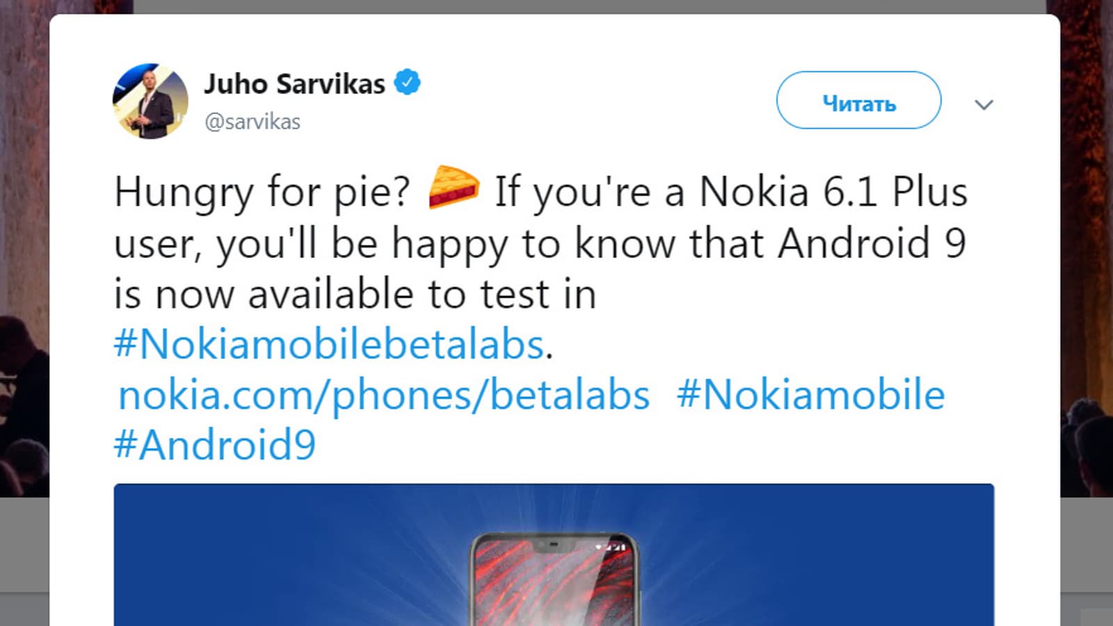 Представляя на прошлой неделе смартфон Nokia 7.1, компания HMD Global пообещала, что модели Nokia 6.1 Plus и Nokia 6.1 в этом месяце получат обновление Android 9. Обещание постепенно воплощается в жизнь: заместитель генерального директора HMD Global Юхо Сарвикас (Juho Sarvikas) сообщил на своей страничке в Twitter, что пользователям Nokia 6.1 Plus доступна бета-версия Android 9.