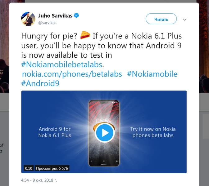 Представляя на прошлой неделе смартфон Nokia 7.1, компания HMD Global пообещала, что модели Nokia 6.1 Plus и Nokia 6.1 в этом месяце получат обновление Android 9. Обещание постепенно воплощается в жизнь: заместитель генерального директора HMD Global Юхо Сарвикас (Juho Sarvikas) сообщил на своей страничке в Twitter, что пользователям Nokia 6.1 Plus доступна бета-версия Android 9.