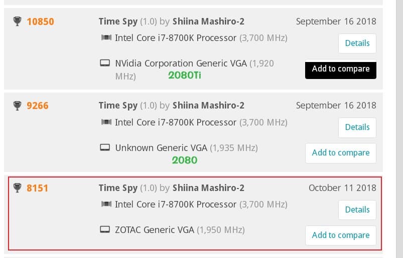 Как можно видеть, RTX 2080 набирает 9266 баллов, а RTX 2080 Ti — 10 850 баллов. Также стоит отметить, что GTX 1080 набирает в среднем около 7500 баллов. Таким образом, результат RTX 2070 укладывается в «логику» карт Turing, ведь RTX 2080, в свою очередь, также немного быстрее GTX 1080 Ti.
