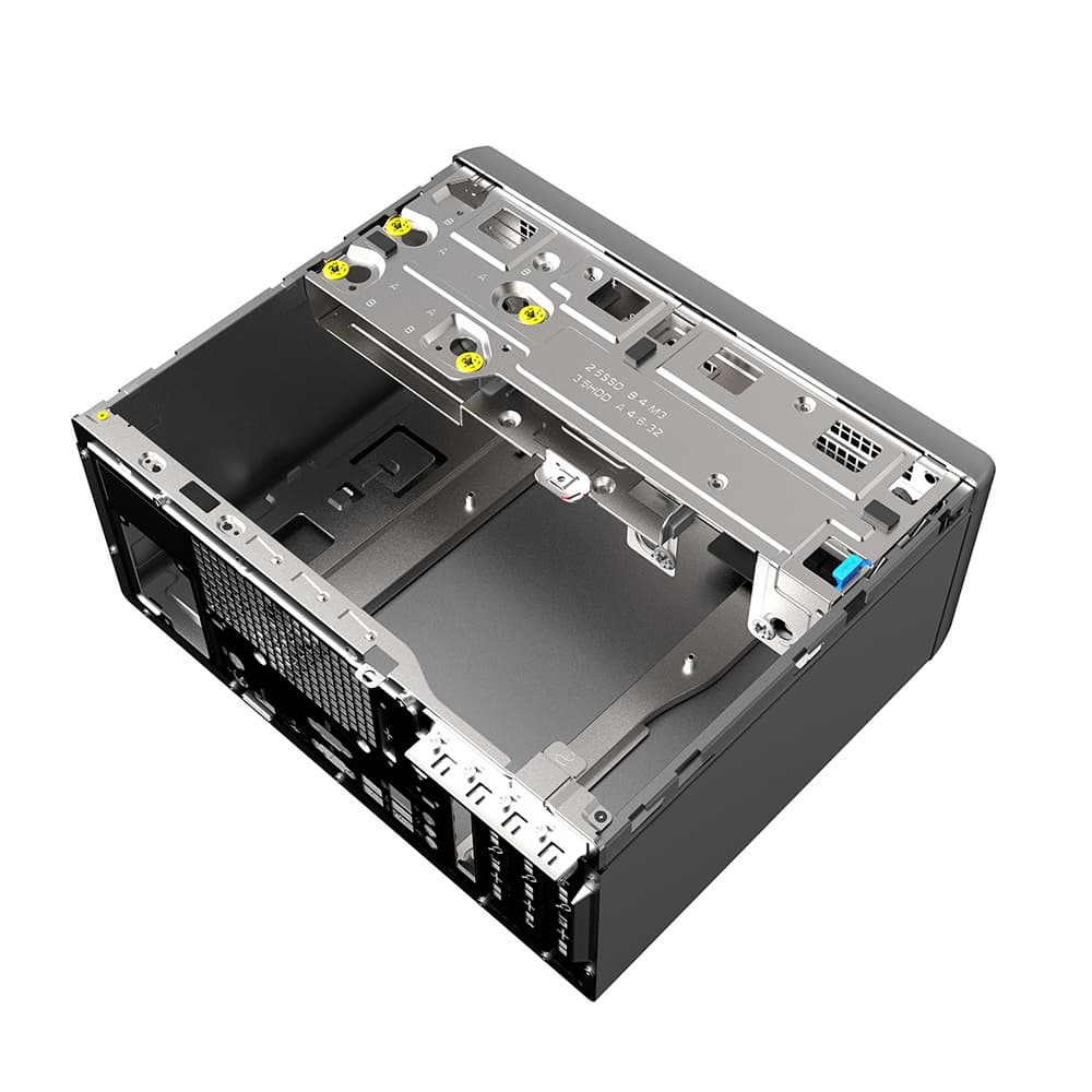Возможна установка тонкого привода оптических дисков и двух накопителей, из которых один может быть типоразмера 3,5 дюйма или 2,5 дюйма, а второй — только 2,5 дюйма. Накопители устанавливаются в корзине, поворачиваемой для удобства монтажа и демонтажа.