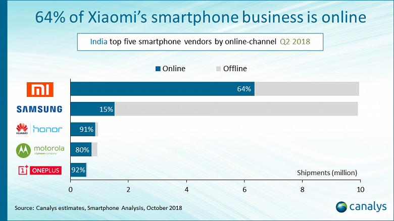 Лидером онлайн-продаж была Xiaomi, которая таким образом реализовала более 6 млн устройств. В продажах китайского гиганта лишь 36% пришлось на розницу. У Samsung доля онлайн-продаж весьма несущественная — 15%. Зато у Honor, Motorola и OnePlus она достигает 91%, 80% и 92%.