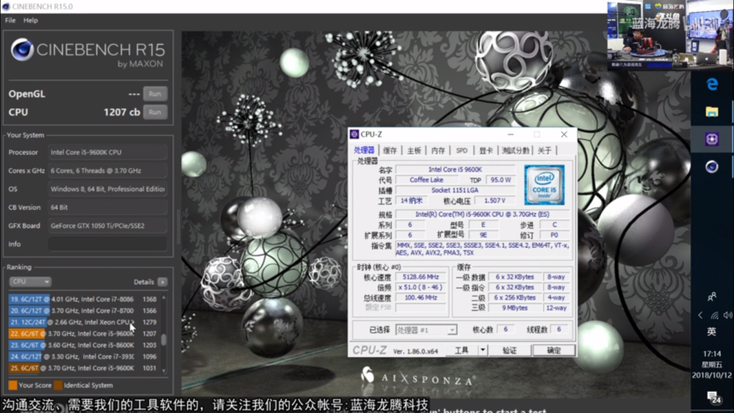 - Core i5-9600K, разгон до 5,13 ГГц: 1207 CB.