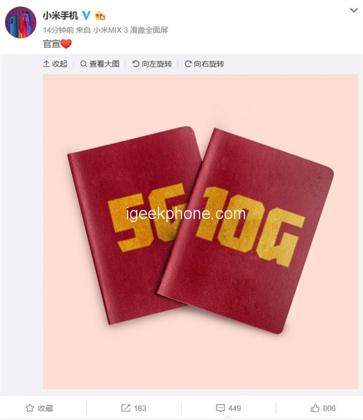 Очередной тизер, который был опубликован на официальной страничке компании в социальной сети Weibo, указывает на то, что Xiaomi Mi Mix 3 станет самым важным для компании смартфоном в этом году. Он предложит не только инновационный дизайн, но и поддержку новых технологий. Источники подтверждают, что старшая версия Xiaomi Mi Mix 3 получит 10 ГБ оперативной памяти и поддержку сетей пятого поколения.