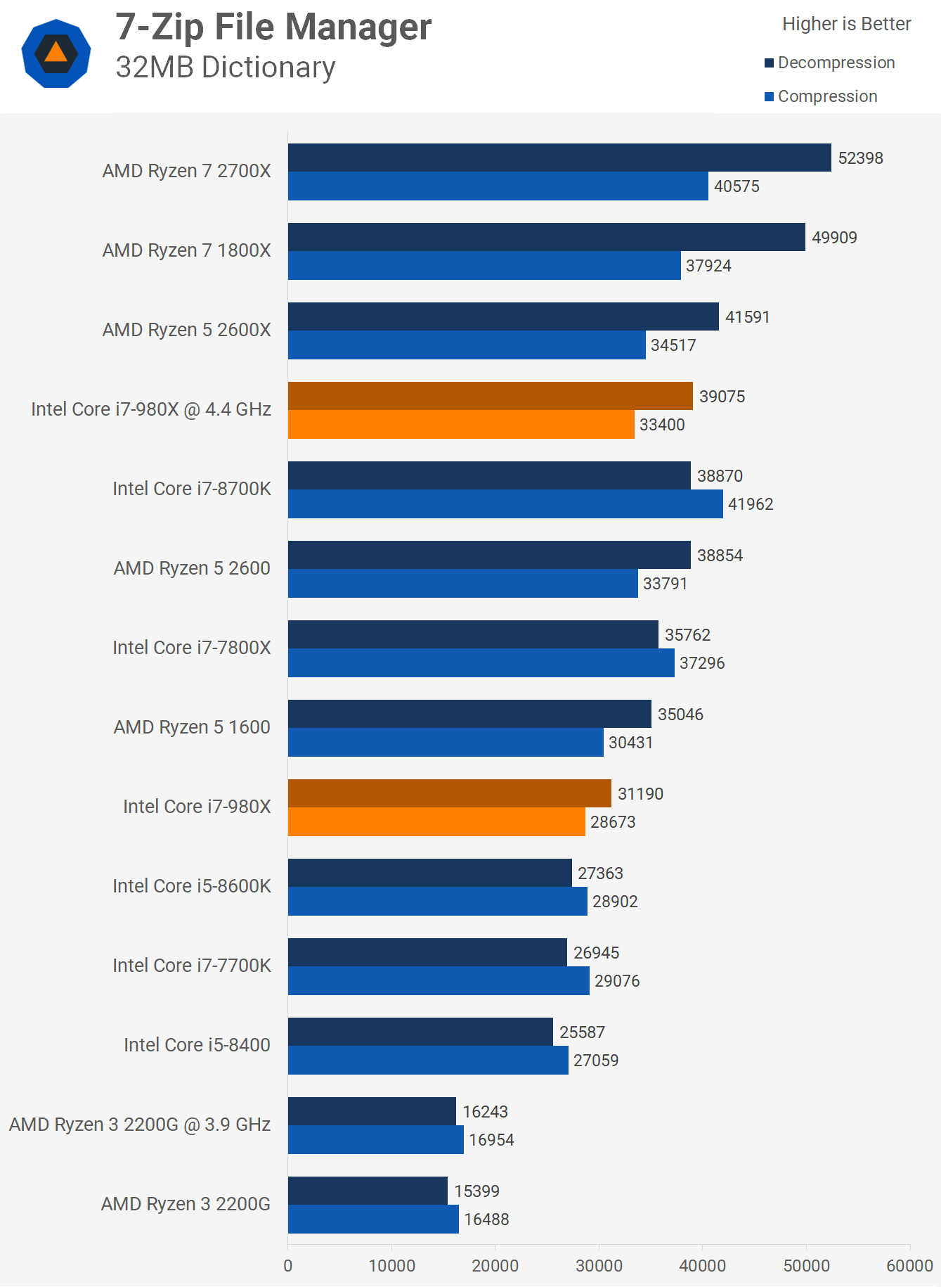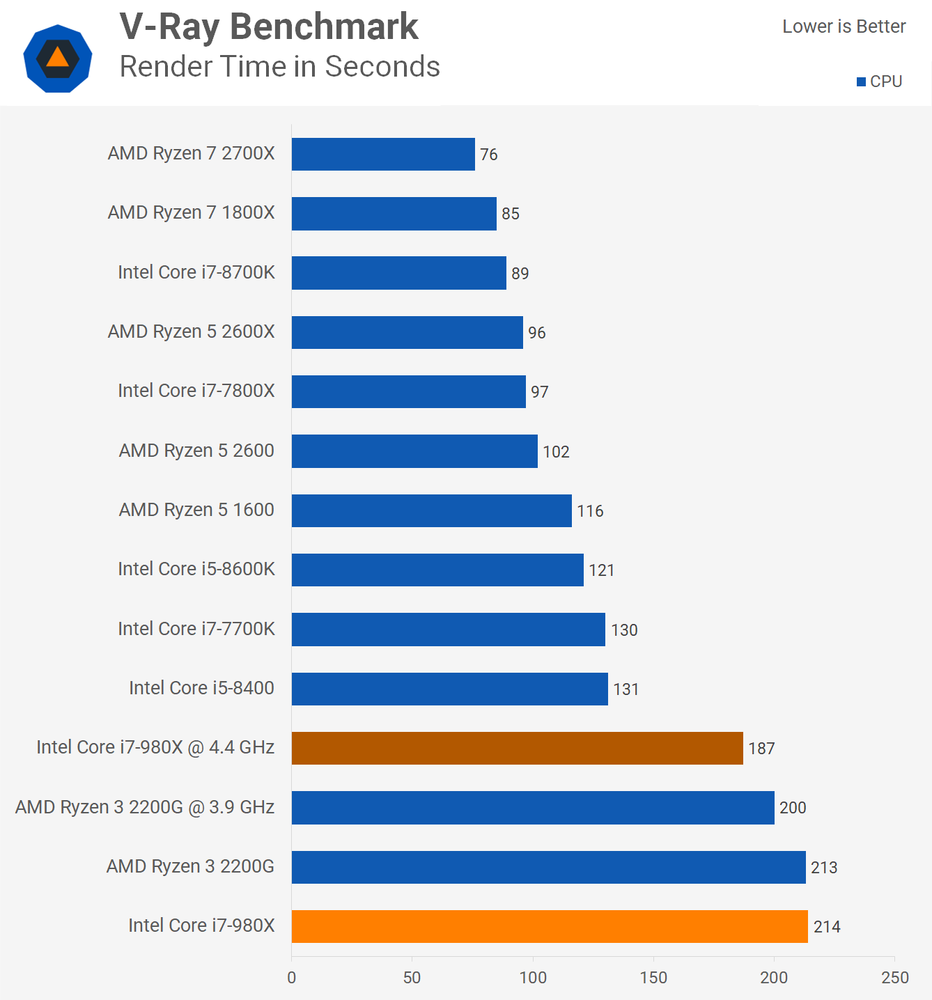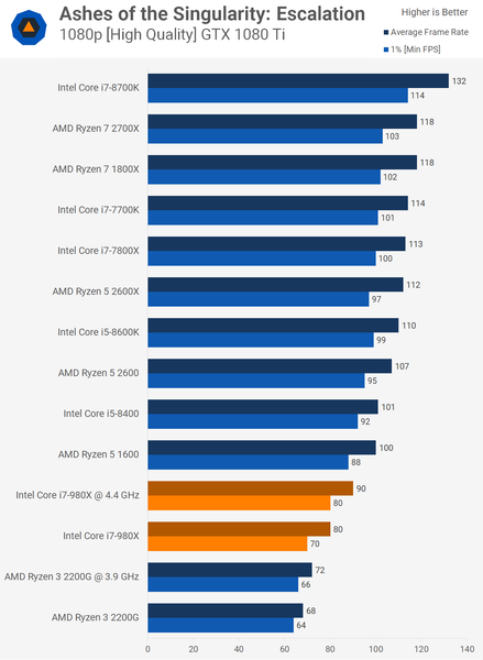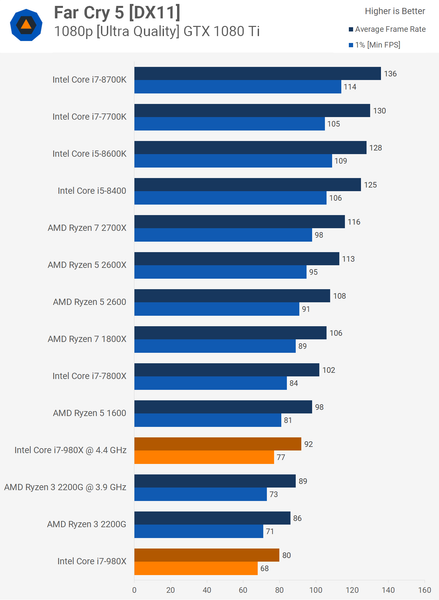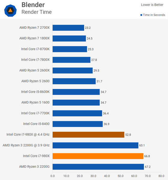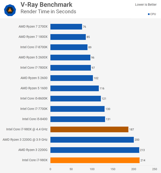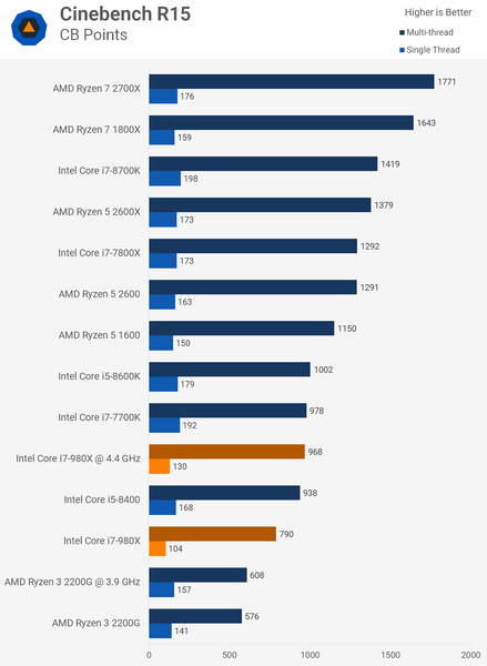 На этом фоне специалисты ресурса TechSpot решили проверить, далеко ли ушли CPU за последние восемь лет. Они взяли шестиядерный процессор Core i7-980X, который вышел в 2010 году по цене 1000 долларов и сравнили его с рядом других современных CPU, включая Ryzen 3 2200G, который стоит 100 долларов. Противостояние выстраивалось именно между этими двумя решениями, хотя благодаря наличию на диаграммах других процессоров, сравнение вышло намного более объёмным. Итак, результаты.