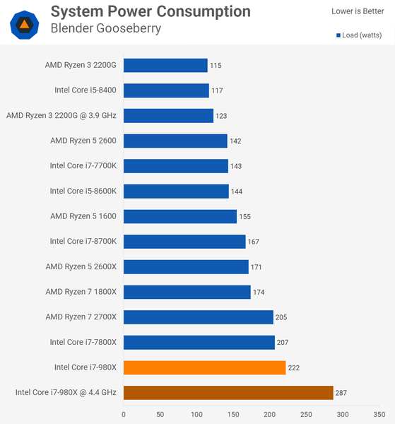 Если по параметрам разница в TDP между Core i7-980X и Ryzen 3 2200G составляет 65 Вт, то в реальности она куда больше. В номинальном режиме это около 100 Вт (нужно учитывать и разницу в энергопотреблении наборов логики), а в разгоне она достигает отметки 160 Вт.