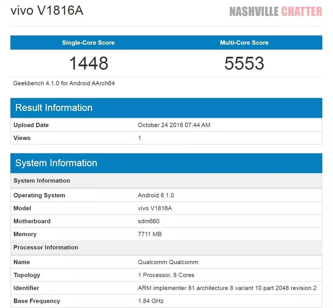 В базе данных тестового пакета Geekbench появились результаты тестирования и некоторые характеристики нового смартфона Vivo с модельным номером V1816A.