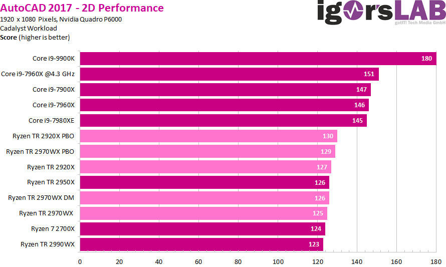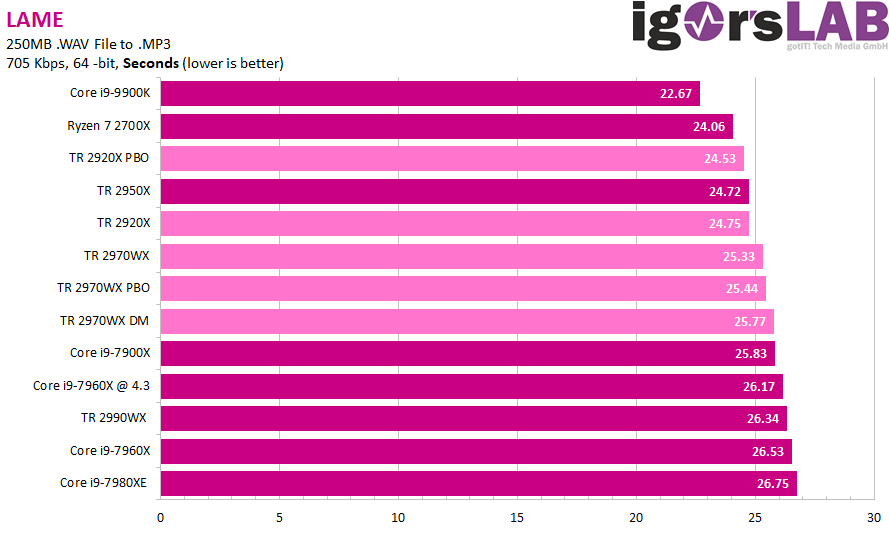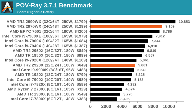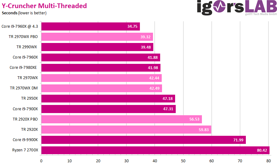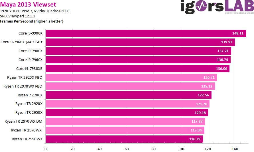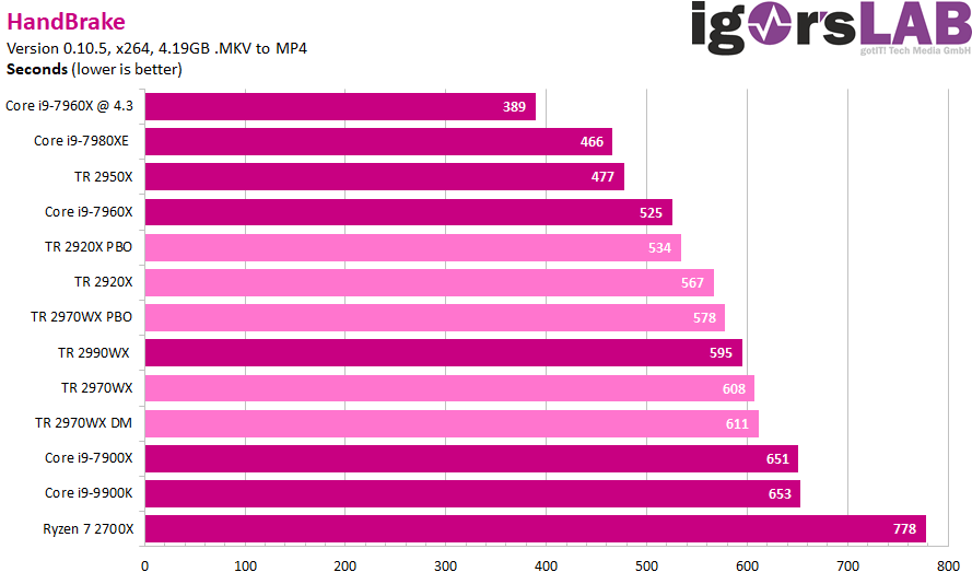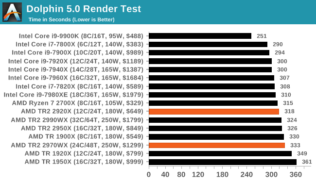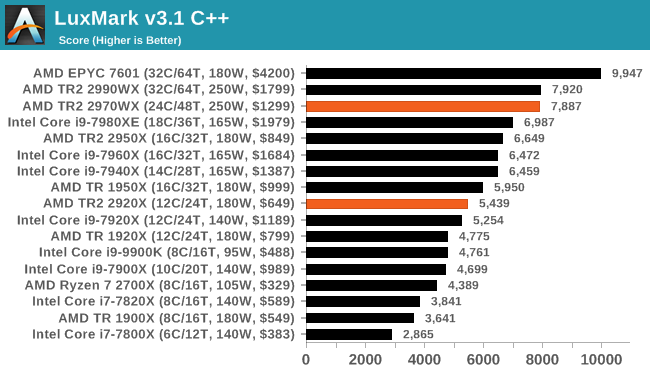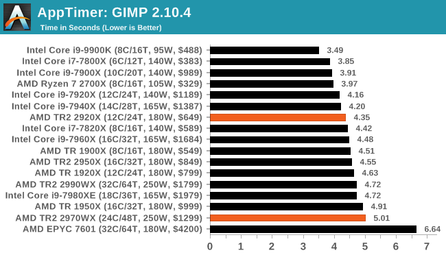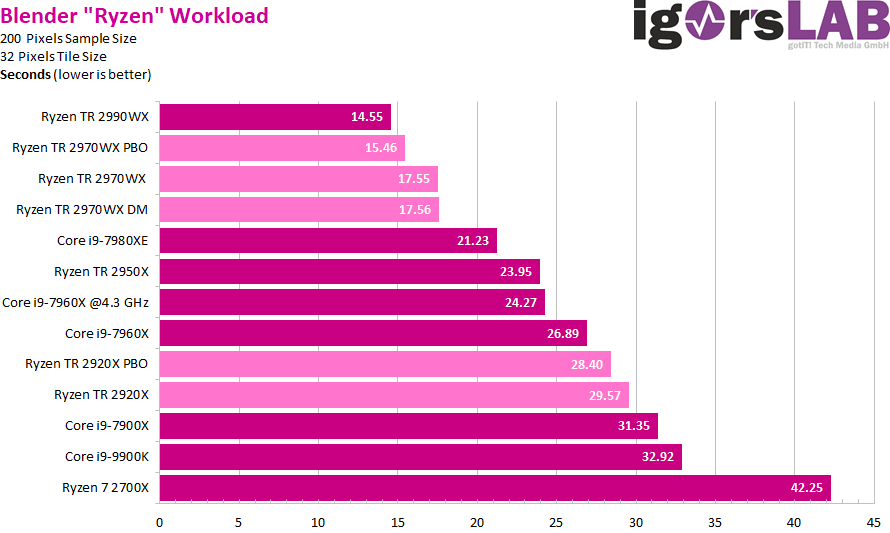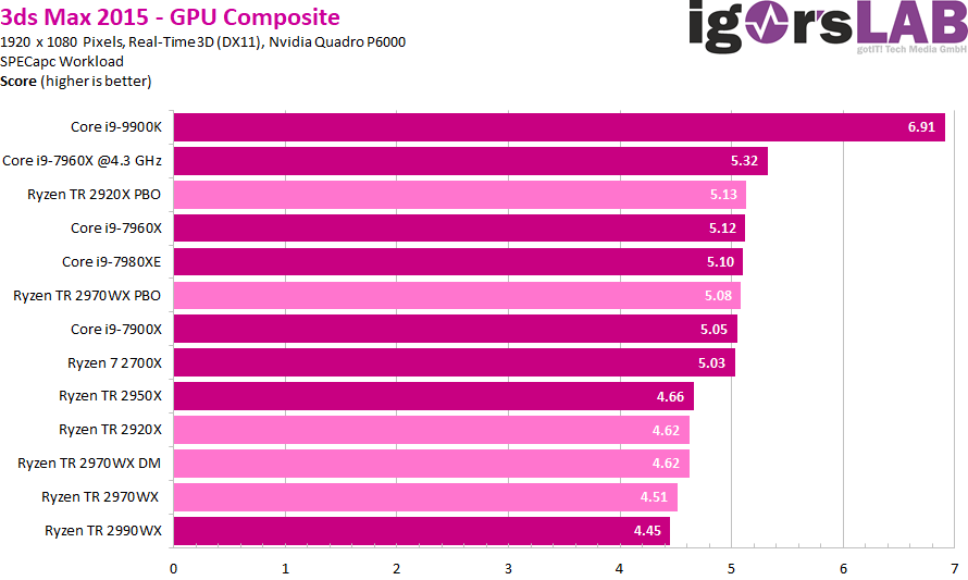 Как можно видеть, ситуация очень сильно зависит от приложения. Где-то процессоры Ryzen Threadripper являются неоспоримыми лидерами, значительно опережая даже более дорогие CPU Intel. В где-то даже Core i9-9900K опережает любой из процессоров AMD, хотя это скорее минус для ПО, нежели плюс для какого-либо CPU.