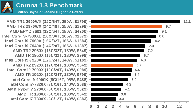 Сегодня в продажу поступили процессоры Ryzen Threadripper 2970WX и 2920X, представленные ещё в начале августа. Напомним, первый располагает 24 ядрами с частотами 3,0-4,2 ГГц и стоит 1300 долларов, а второй получил 12 ядер с частотами 3,5-4,3 ГГц при цене 650 долларов.