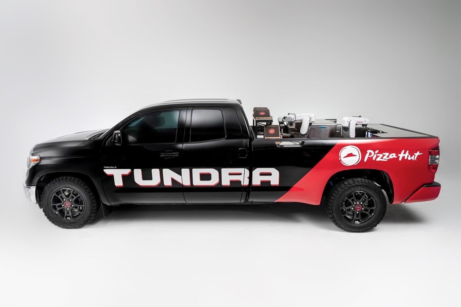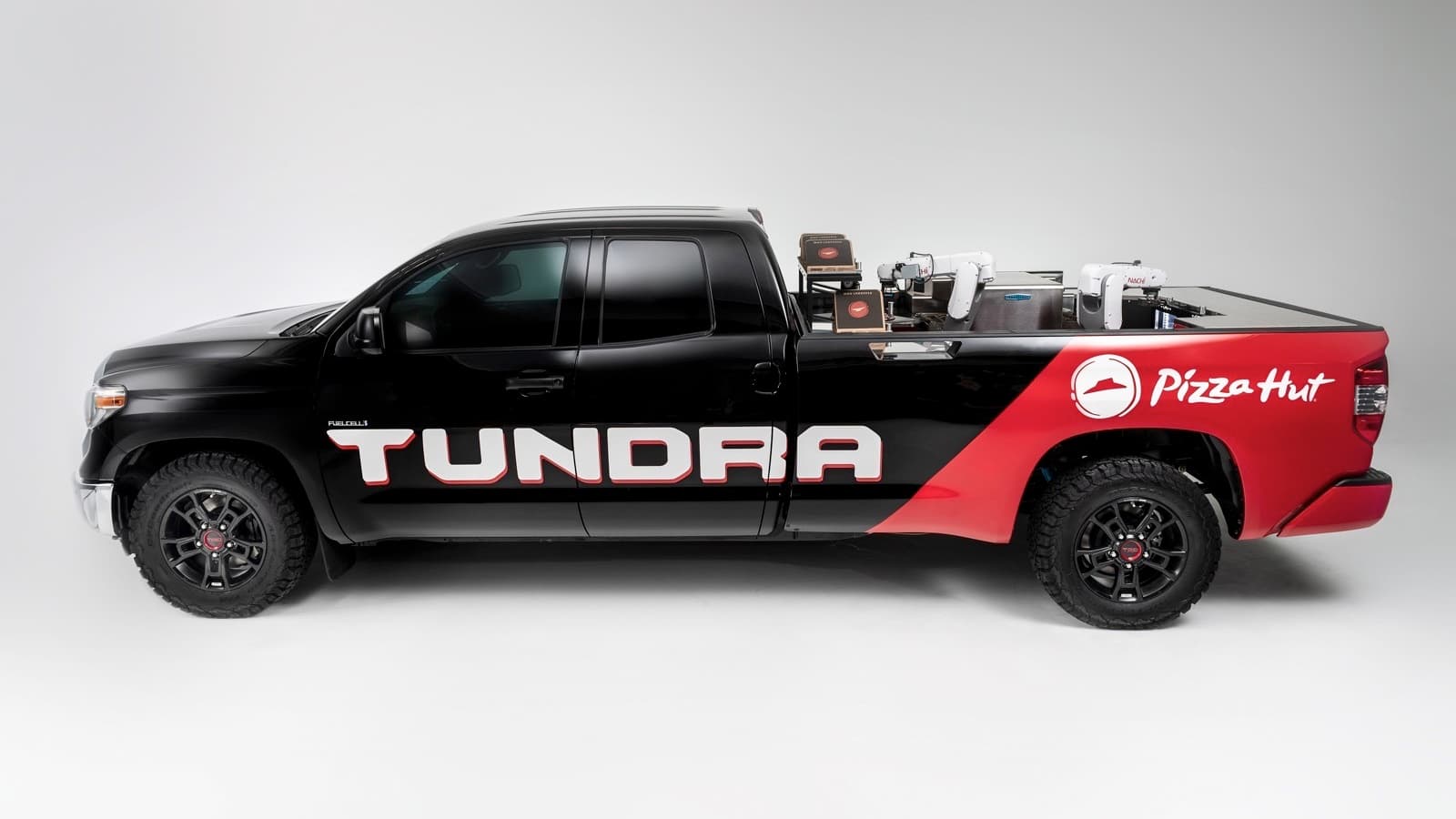 Компания Pizza Hut объединилась с Toyota для создания концептуального автомобиля Tundra PIE Pro. Как ясно из названия, авто построено на базе внедорожника Tundra. Уникальность машины в том, что это мобильная роботизированная пиццерия.