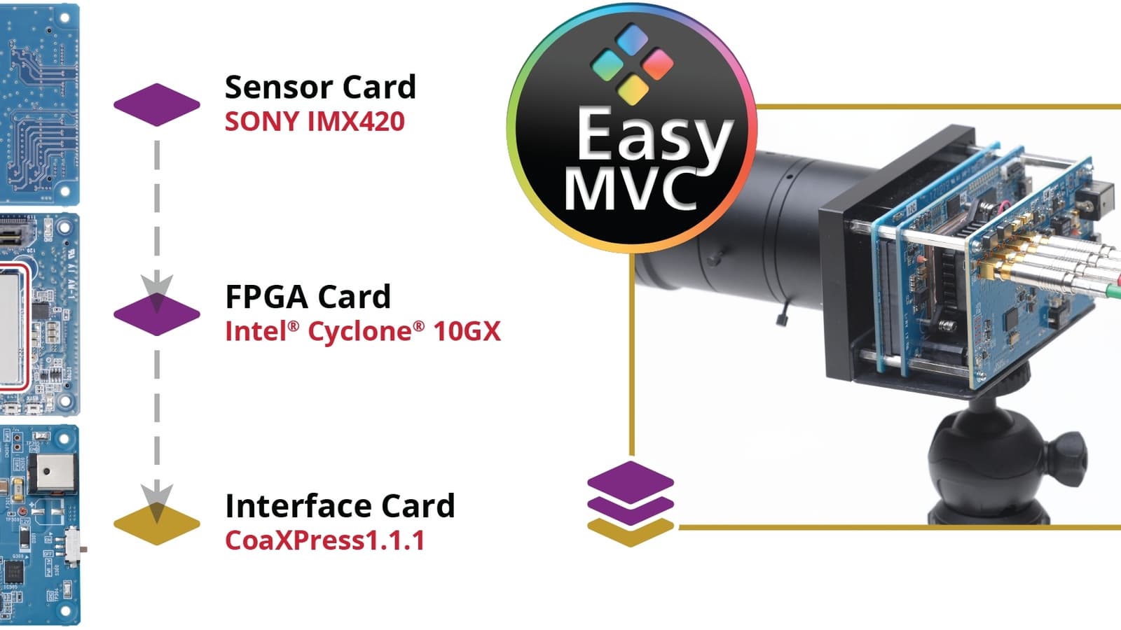 Разделение на три платы — плату датчика изображения, плату FPGA и интерфейсную плату — позволяет быстро менять ключевые компоненты, оценивая их в работе без необходимости перепроектировать и изготавливать новый вариант всего решения. Дополнительно упрощают проектирование примеры разработки аппаратного и программного обеспечения, предоставляемые Macnica.