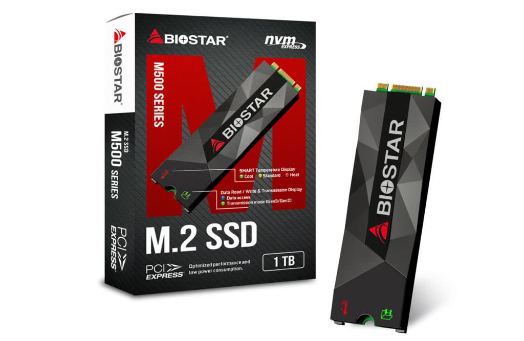 Компания Biostar представила линейку твердотельных накопителей M500 типоразмера M.2-2280, снащенных интерфейсом PCIe 3.0 x2. Они поддерживают протокол NVMe 1.2 и выпускаются объемом 128 ГБ, 256 ГБ, 512 ГБ и 1 ТБ. Объем кэш-памяти DDR3L равен 256 МБ, 256 МБ, 512 МБ и 1 ГБ соответственно. Скорость последовательного чтения достигает 1700 МБ/с, последовательной записи — 1100 МБ/с.