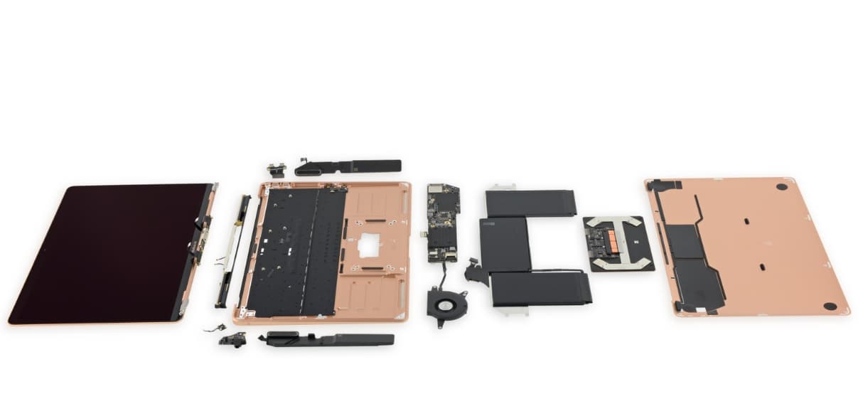 В итоге ноутбук заработал три балла из десяти. В плюсы записали модульность некоторых компонентов. В минусы — интегрированную в корпус клавиатуру, распаянные CPU, оперативную память и накопитель. Также отметили наличие фирменных винтов pentalobe и необходимость демонтажа печатной платы для замены аккумулятора.
