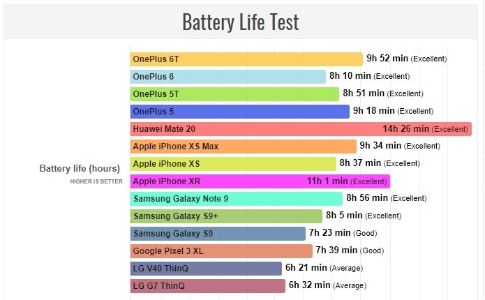 Как можно видеть, уступает новинка лишь Huawei Mate 20 с его просто феноменальным результатом, и iPhone XR. Напомним, новинка OnePlus оснащается аккумулятором ёмкостью 3700 мА·ч, что больше, чем у многих других современных флагманов.