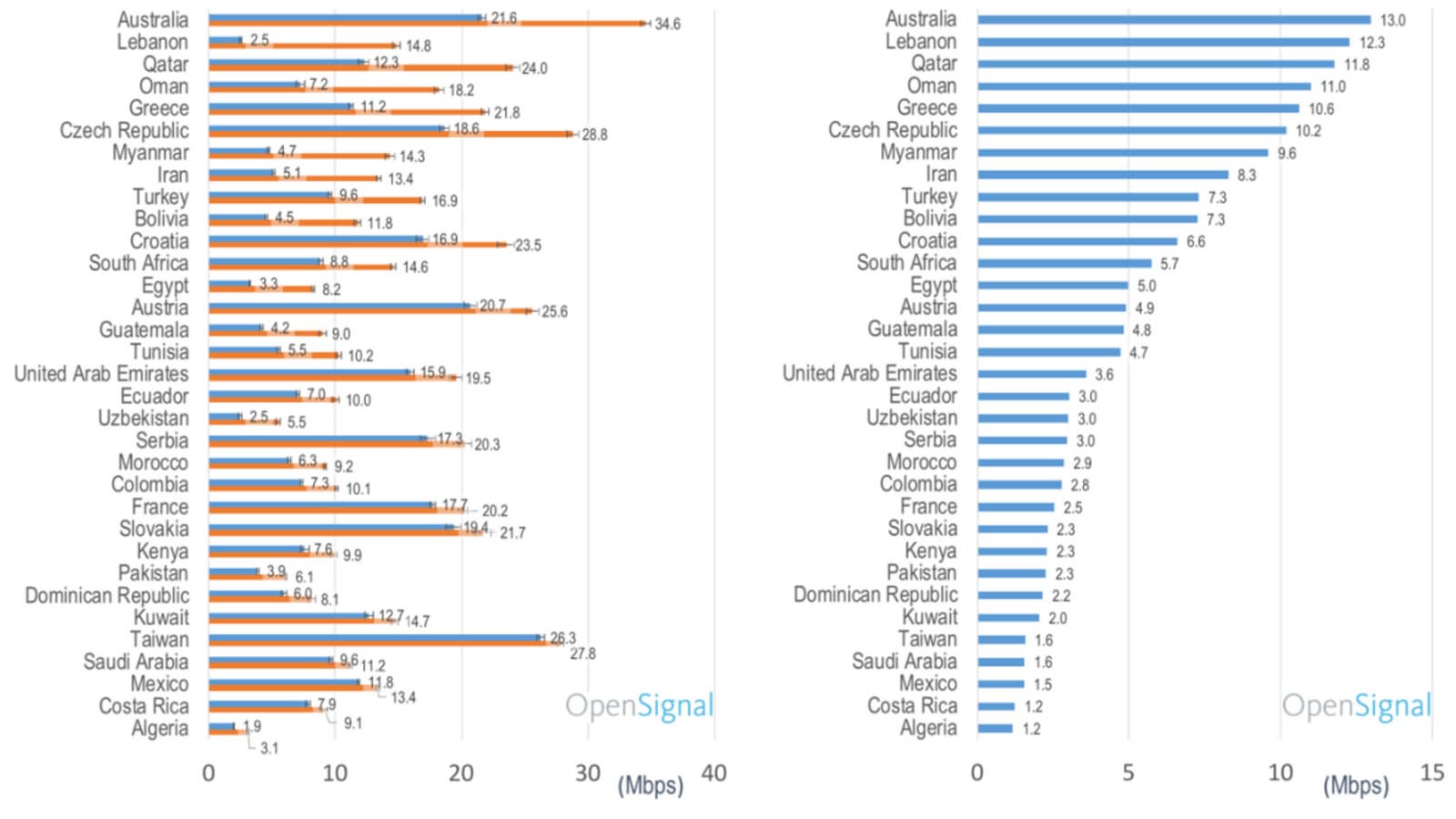 Список был составлен на основании превосходства мобильного интернета над Wi-Fi, возглавила его Австралия, где средняя скорость мобильного интернета составляет 34,6 Мбит/с, тогда как по Wi-Fi скорость составляет в среднем 21,6 Мбит/с.