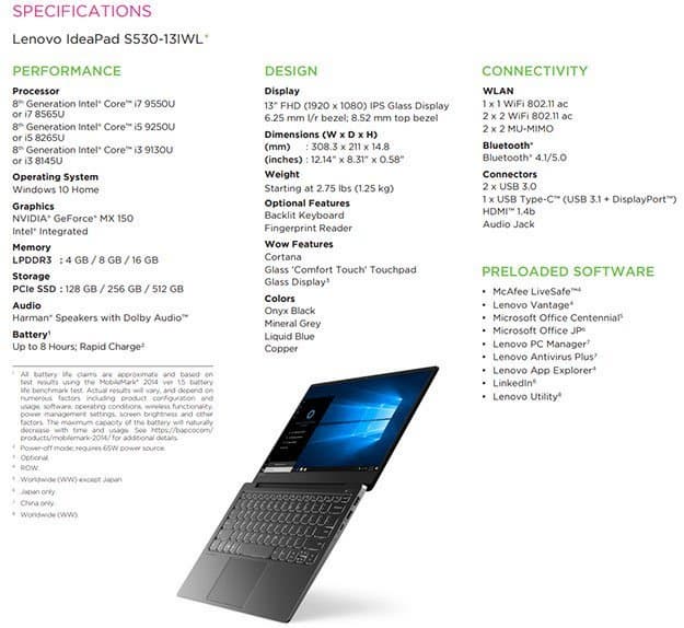 Спецификация мобильного компьютера Lenovo IdeaPad S530-13IWL неожиданно стала источником сведений о существовании новых мобильных процессоров Intel серии 9000. Производитель упоминает три модели: Core i7-9550U, Core i5-9250U и Core i3-9130U.