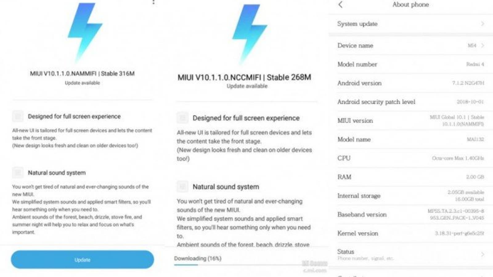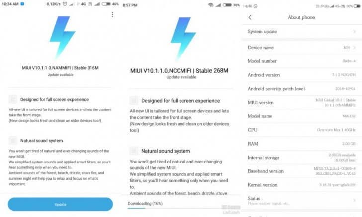 Обновление для Redmi 4 называется MIUI 10.1.1.0.NAMMFI и занимает 316 МБ. Обновление для Redmi 4A немного полегче, 268 МБ. Оно носит обозначение MIUI 10.1.1.0.NCCMIFI.