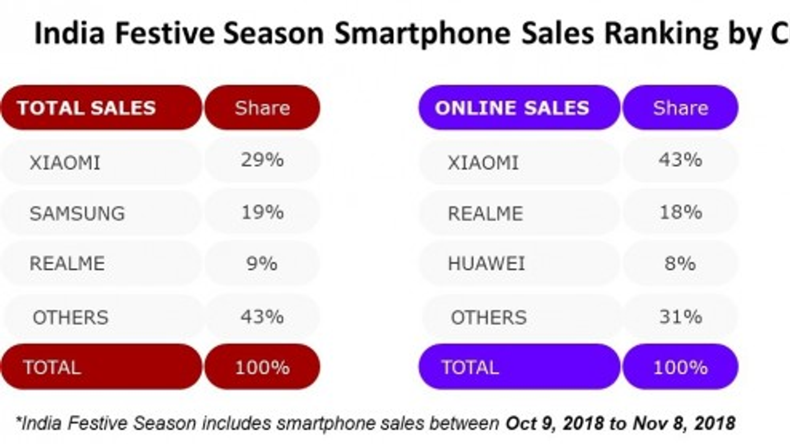 Лидером по онлайновым и суммарным продажам стала компания Xiaomi, на долю которой пришлось 43% и 29% соответственно. Второе место в категории онлайновых продаж несколько неожиданно занял бренд Oppo Realme с результатом 18%, который в общем зачете занял третье место с долей 9%.