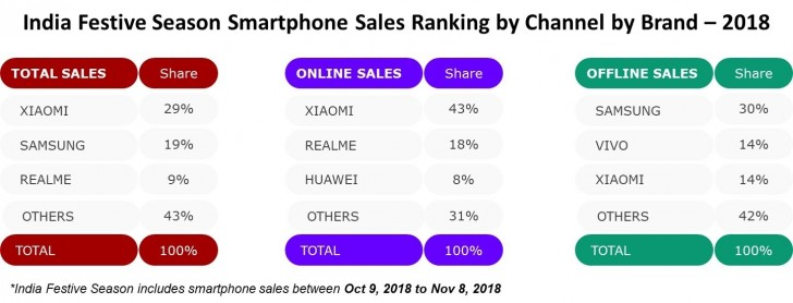 Лидером по онлайновым и суммарным продажам стала компания Xiaomi, на долю которой пришлось 43% и 29% соответственно. Второе место в категории онлайновых продаж несколько неожиданно занял бренд Oppo Realme с результатом 18%, который в общем зачете занял третье место с долей 9%.