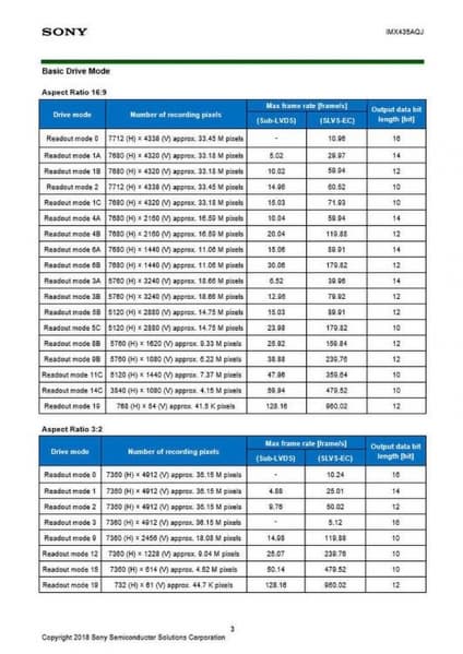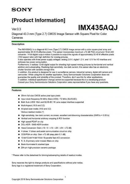 Источник опубликовал оказавшиеся в его распоряжении изображения страниц с описанием нового полнокадрового датчика изображения Sonу. Новинка, изготавливаемая по технологии CMOS, называется IMX435AQJ. Ее разрешение равно 36 Мп. Датчик поддерживает съемку видео 8К.