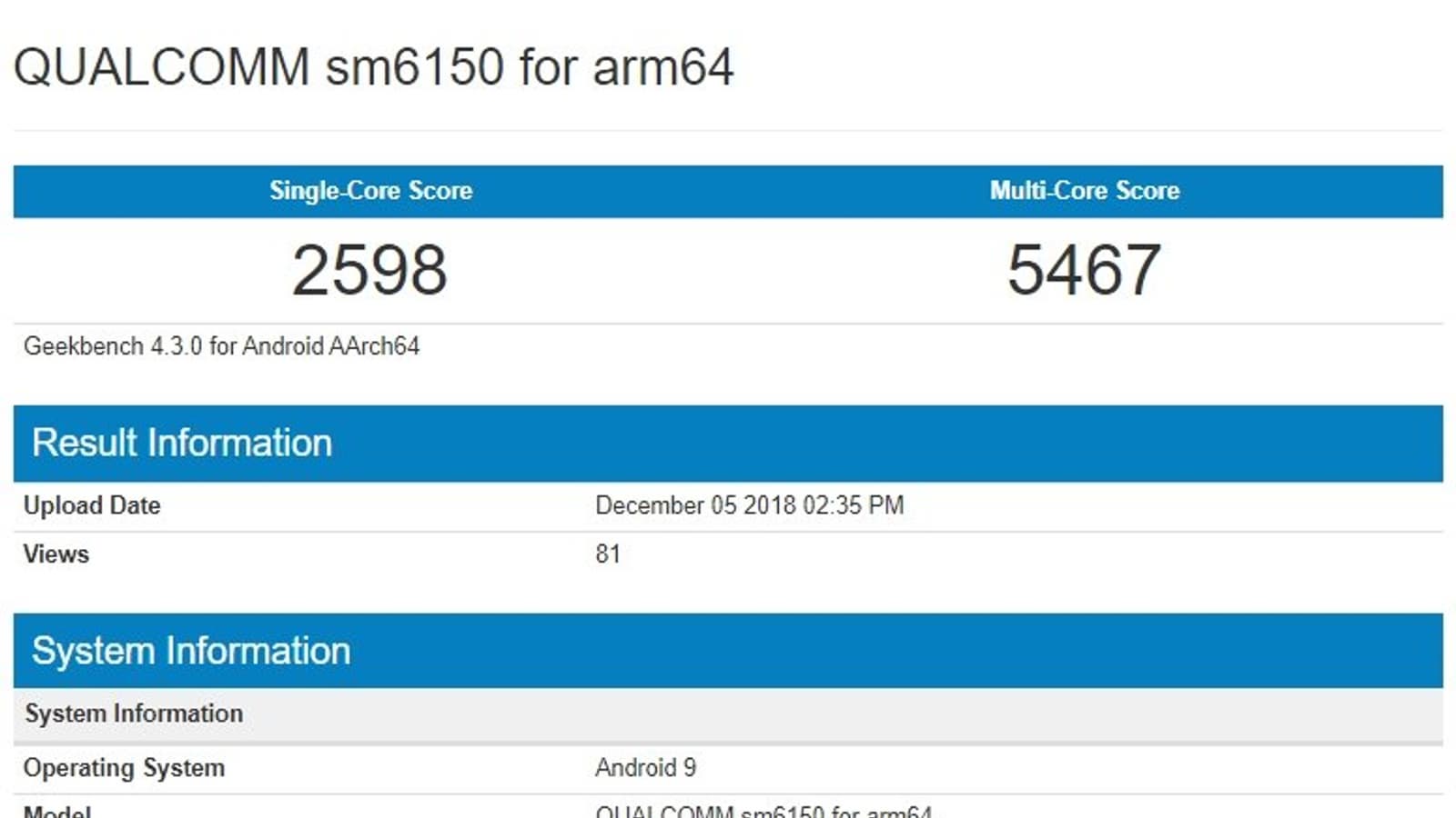 Итак, неизвестный аппарат, судя по всему, являющийся тестовым устройством Qualcomm, оснащённый 6 ГБ, набрал 2598 и 5467 баллов в однопоточном и многопоточном режимах соответственно. Частота GPU при этом составляла 1,8 ГГц.