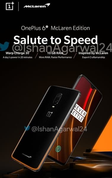 EXCLUSIVE LEAK! Here is your first look at the Official Renders of the OnePlus 6T McLaren Edition Speed Orange variant with 10GB+256GB Storage and super fast new 'Warp Charge' which will provide you a day's power in 20 minutes! Do you like the phone?#SaluteToSpeed#WarpCharge pic.twitter.com/8JdoNb6SWG