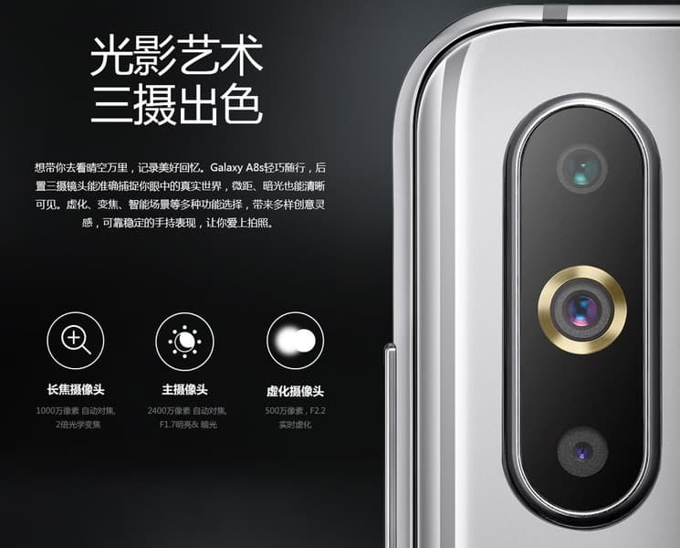 Samsung Galaxy A8s построен на однокристальной платформе Qualcomm Snapdragon 710, имеет 6-8 ГБ оперативной и 128 ГБ встроенной флэш-памяти. Фронтальная камера представлена датчиком изображения разрешением 24 Мп и широкоугольным объективом.