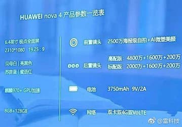Опубликованы все характеристики смартфона Huawei Nova 4: экран диагональю 6,4 дюйма, SoC Kirin 970, 8 ГБ ОЗУ и 48-мегапиксельная камера