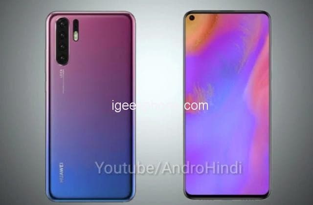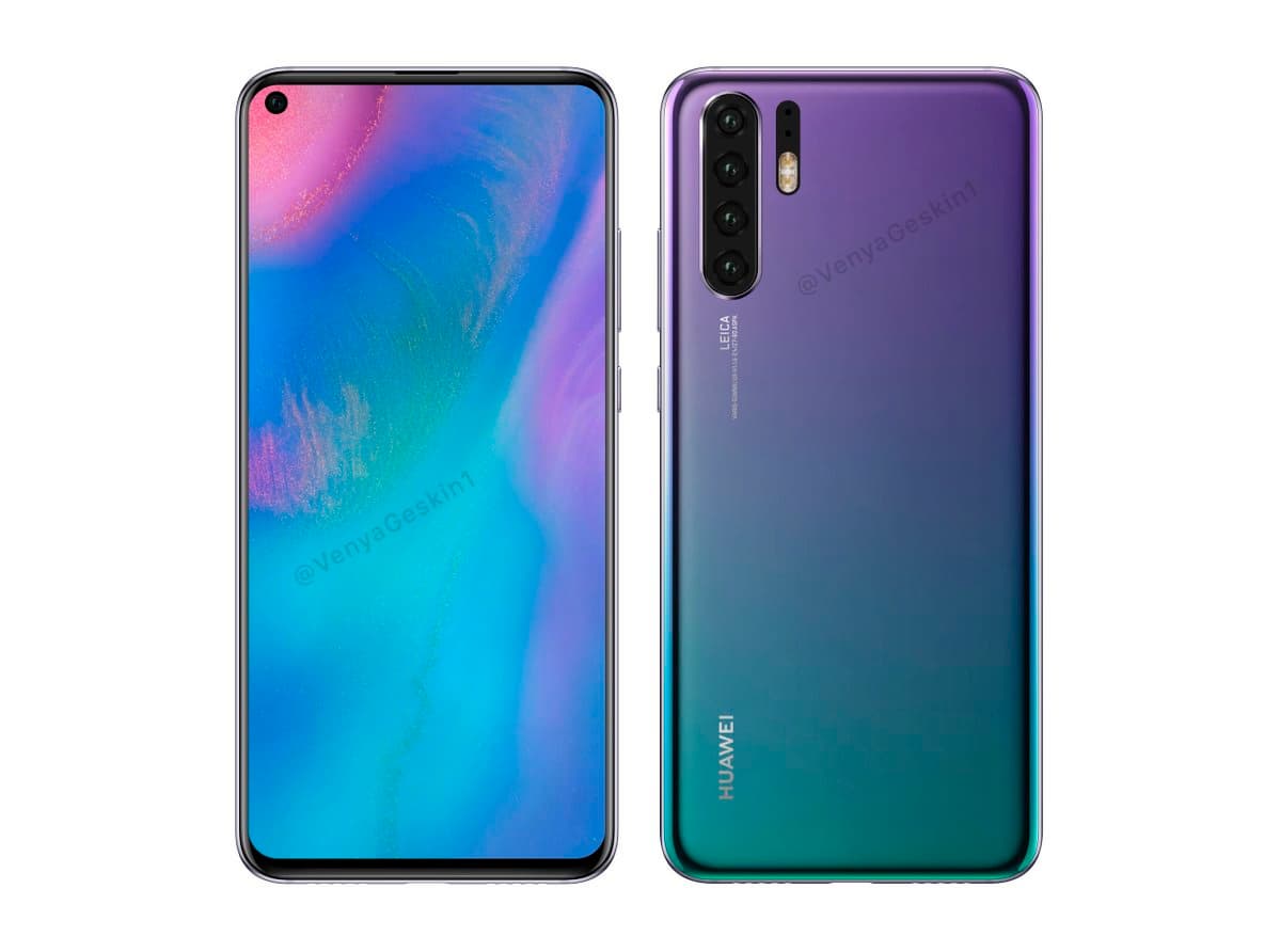 На рендерах показаны главные особенности дизайна Huawei P30 Pro, включая очень тонкие рамки вокруг экрана, точечный вырез под фронтальную камеру и монструозную основную камеру с четырьмя модулями и вспышкой с двумя мощными светодиодами.