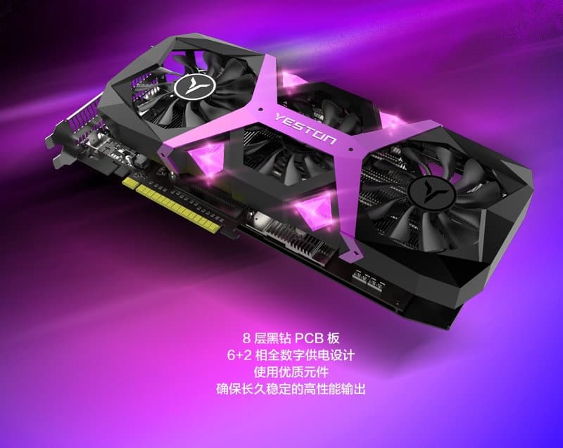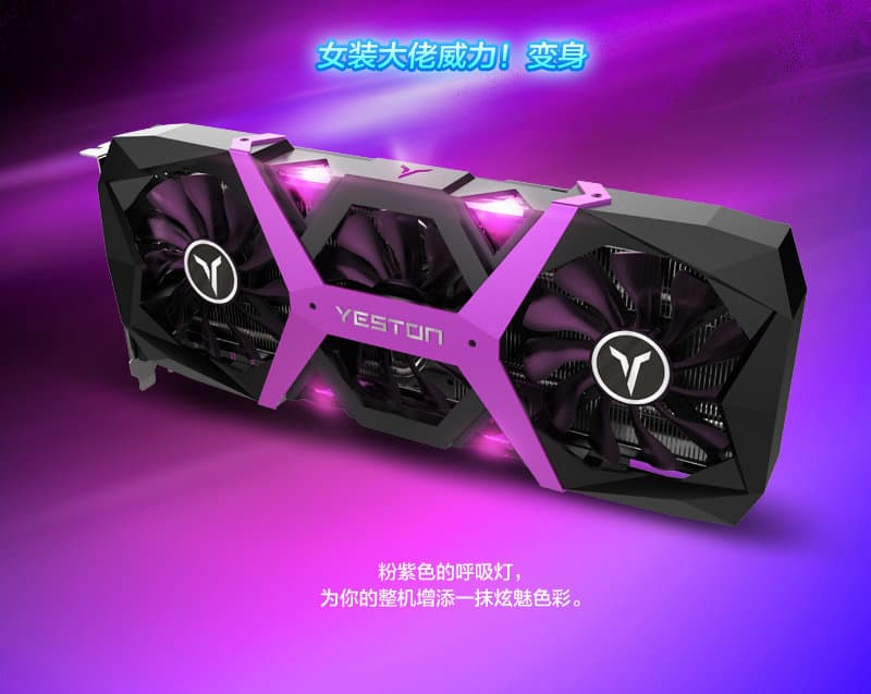 Компания Yeston представила видеокарту Radeon RX 590 Game Ace, которая явно нацелена на вторую категорию. Как можно видеть на изображениях, уникальность этой модели в её цвете. Точнее, в цвете определённых элементов кожуха системы охлаждения. Сиреневый цвет, наверное, ранее не использовался ни в одной другой видеокарте, хотя его можно реализовать за счёт подсветки.
