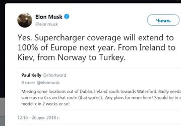 Маск обещает в будущем году покрыть сетью зарядок Tesla всю Европу — «от Ирландии до Киева»