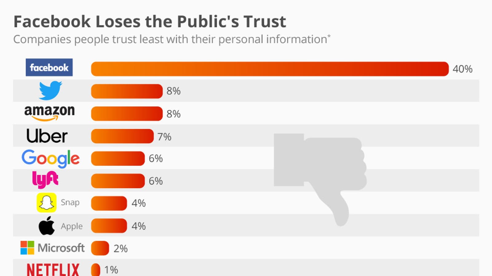 40% опрошенных ответили, что меньше всего доверяют Facebook, что неудивительно, учитывая последние события. Проблемы Facebook напрямую сказываются на её финансовом положении: начиная с конца июля акции компании продолжают падать в цене.