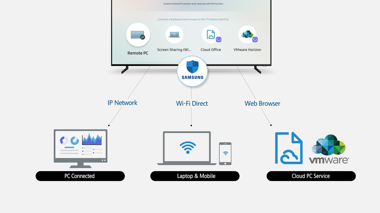 В частности, можно будет подключить к телевизору клавиатуру для более простого и удобного ввода или получить доступ к ПК в другой комнате, чтобы пользоваться интернетом или играть в игры. Помимо отображения контента и управления устройствами, подключенными к телевизору, Remote Access позволяет получить доступ к офисному облачному сервису, чтобы работать с документами. Широкую функциональность обеспечивает решение по виртуализации приложений и рабочих столов VMware Horizon. Для защиты информации в «Удаленный доступ» интегрирована фирменная технология Samsung Knox.