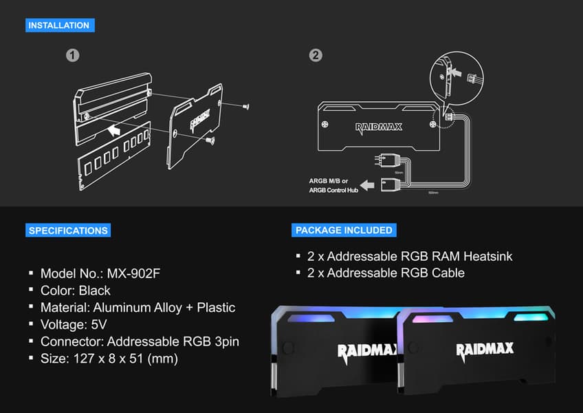 Компания Raidmax выпустила набор радиаторов для модулей памяти DIMM. Особенностью этих радиаторов является наличие адресуемой подсветки.