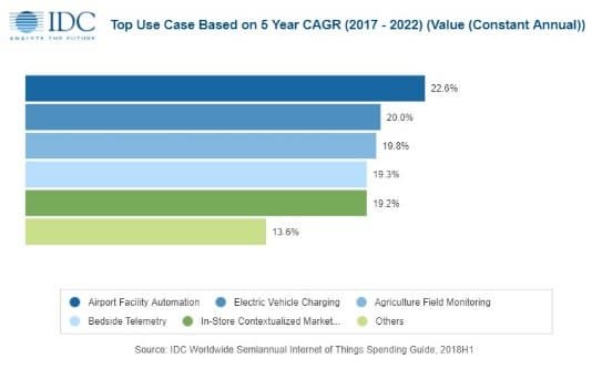 В IDC ожидают, что в 2022 году рынок IoT перевалит за 1 трлн долларов. При этом среднегодовой рост в период с 2017 по 2022 год будет превышать 10%. Наибольший рост — 22,6% — ожидается в сегменте автоматизации аэропортов.