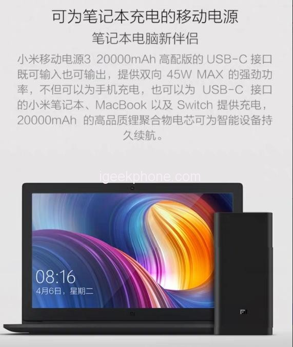 Xiaomi PowerBank 3: High Version характеризуется емкостью 20 000 мА•ч, он поддерживает быструю зарядку в обоих направлениях при мощности 45 Вт. Xiaomi заявляет, что вы вполне можете заряжать не только смартфоны и планшеты, но также ноутбуки Xiaomi, MacBook и игровую приставку Switch.