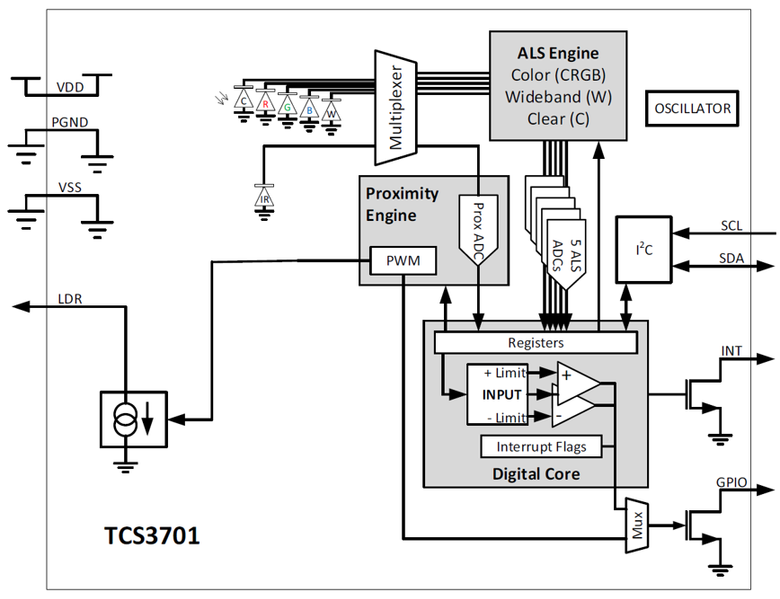 По сути, TCS3701 воспринимает прибавку окружающего света, проходящего через дисплей, к свету, излучаемому пикселями самого дисплея, расположенными рядом с датчиком. Как утверждается, были разработаны «уникальные алгоритмы, которые позволяют точно определять уровни окружающего освещения без знания яркости пикселей дисплея над датчиком».