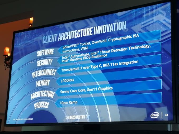 Для мобильных устройств важны всевозможные интерфейсы подключения, и на этом поле Ice Lake-U предложат поддержку Wi-Fi 6 (Wi-Fi 802.11ax) и Thunderbolt 3 через порты USB-C. Наконец, еще одно немаловажное улучшение в рамках готовой системы – повышение автономности до 25 часов и выше. Это сделано как за счет оптимизации самой однокристальной системы, коей, по сути, Ice Lake-U и является, так и всей аппаратной платформы (системной платы, компонентов), которая будет предложена сборщикам ноутбуков. Так, к примеру, для стандартного 12-дюймового лэптопа удалось выкроить 10% внутреннего пространства, что позволяет увеличить емкость аккумуляторной батареи с 52 до 58 Вт·ч.