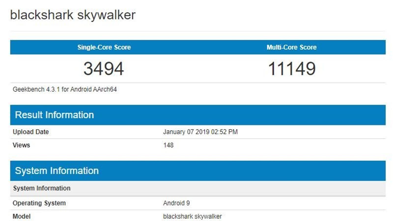 Смартфон фигурирует под кодовым обозначением blackshark skywalker, но товарное название будет иным. Например, Black Shark 3 или Black Shark Helo 2. Как видно, аппарат базируется на SoC msmnile – это кодовое название платформы Snapdragon 855. На флагманскую производительность указывают также результаты теста бенчмарка: 3494 балла в однопоточном тесте и 11149 баллов в многопоточном – примерно такой же результат в Geekbench продемонстрировал инженерный образец на SoC Qualcomm Snapdragon 855 несколько дней тому назад.