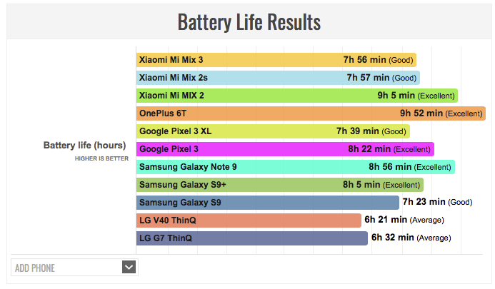 Xiaomi Mi Mix 3 показал не самые лучшие, но и не самые худшие результаты. Он «протянул» 7 часов 56 минут без подзарядки. Для сравнения, прошлогодний Xiaomi Mi Mix 2s продержался всего на одну минуту дольше, а Xiaomi Mi Mix 2, выпущенный в 2017 году — 9 часов и 5 минут. Samsung Galaxy S9+ показал немногим лучшие результаты, а Galaxy S9 — худшие. Заметно обогнали — OnePlus 6T, Huawei Mate 20 Pro и iPhone XR.