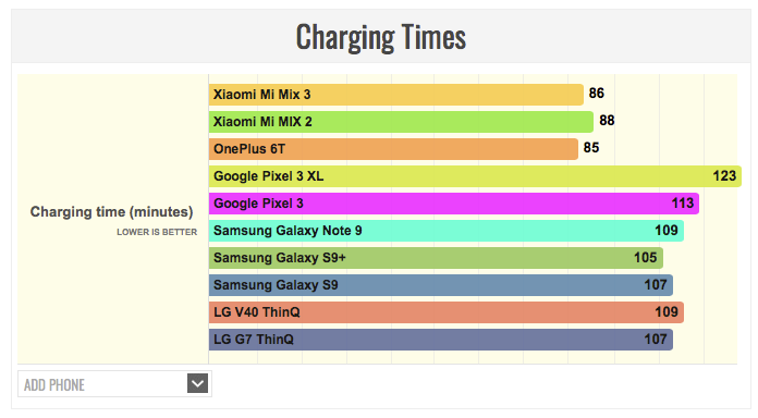 Время зарядки с нуля до 100% с использованием комплектной зарядки мощностью 18 Вт составило 86 минут, на минуту медленнее OnePlus 6T, но быстрее Mi Mix 2.