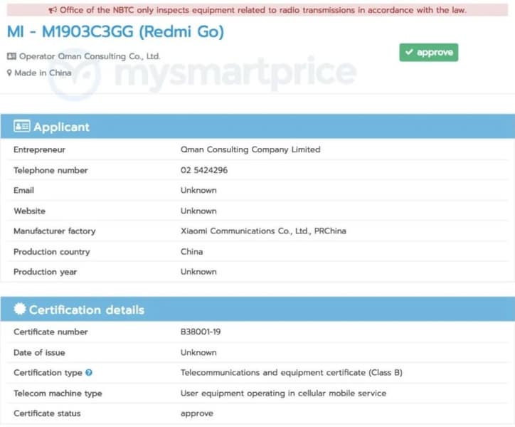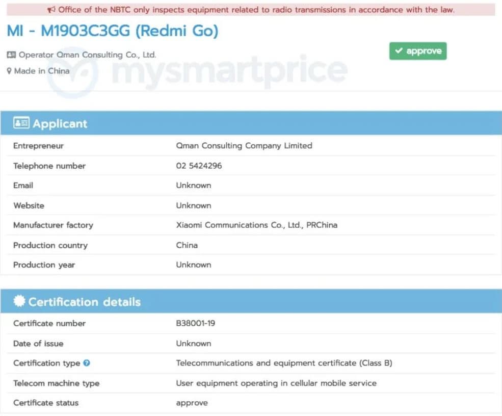Смартфон Redmi Go под управлением ОС Android 9.0 (Go Edition) продолжает свое шествие по органам сертификации различных стран. Ранее аппарат уже получил необходимые сертификаты в США (FCC), Европе (EEC) и Малайзии (SIRIM), а сейчас аппарат успешно прошел тесты и таиландского регулятора. Но что нам с того?